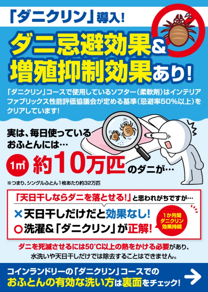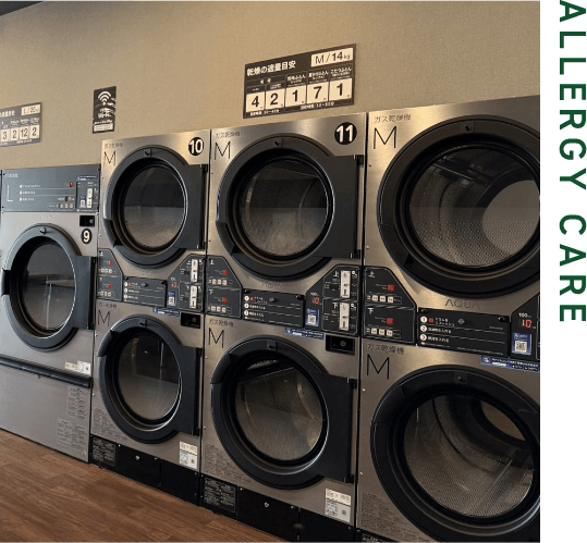 大型洗濯機・乾燥機を完備し、衣類から布団・カーテン・靴までまとめ洗いOK。「ミラブル洗浄」により、繊維の奥の汚れやニオイまで徹底除去。